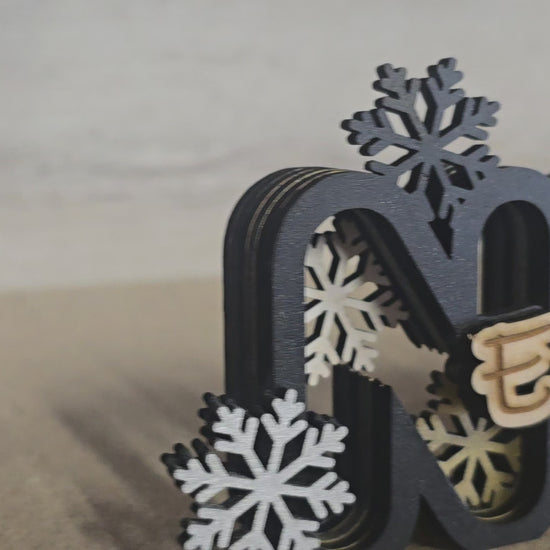 Cette création unique forme le mot NOËL, sublimé par des flocons de neige en relief et l’inscription centrale “En famille”, découpée et gravée avec précision grâce à un graveur laser.